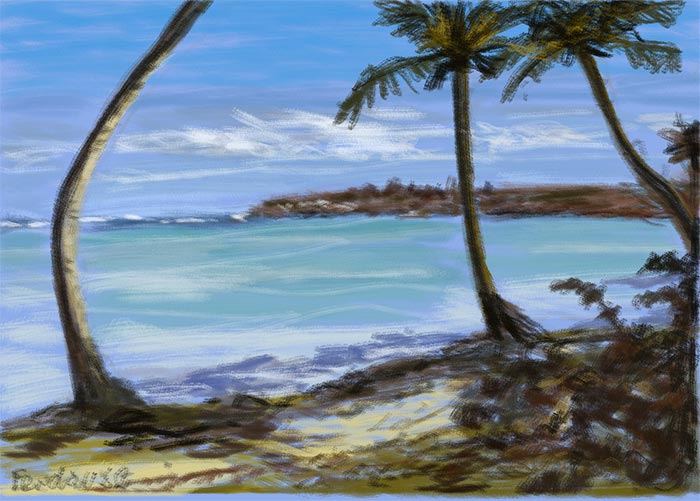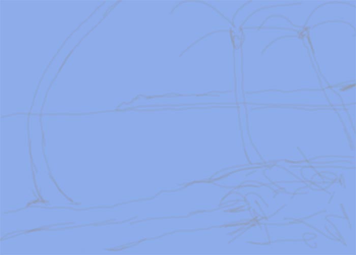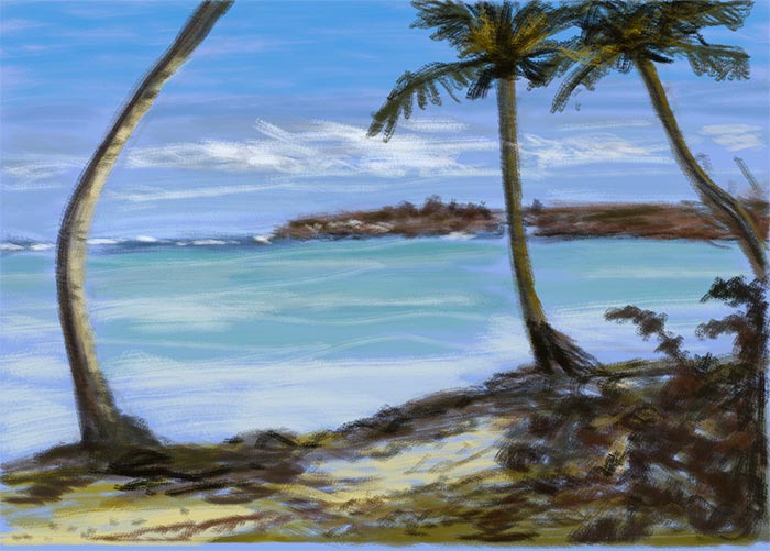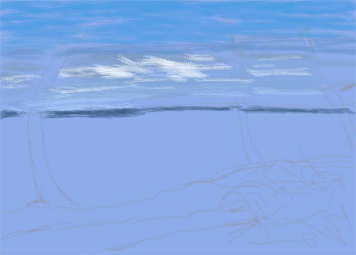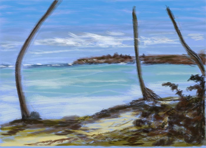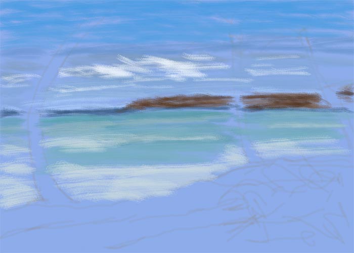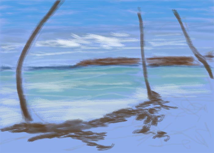 We start off using a blue shade for the background and etch the main parts of the painting as shown in fig. 2. Don’t worry too much about the exact placement, the main thing is to keep the horizontal line the middle roughly linear. I found that when I was filling the sky as shown in fig. 3, I was trying to avoid the trees that I had drawn earlier. In hindsight, I would have probably filled the sky information along with the sea and foreground and then etch out the trees and other components of the scene. I used the ‘shade’ tool for the outline to etch the trees and land mass. By varying the degree of hardness, size and density you can control the translucency of the color applied to the canvas. Use horizontal strokes as shown in the drawing. For the sea, I switched to a turquoise color.