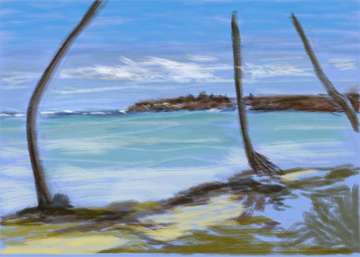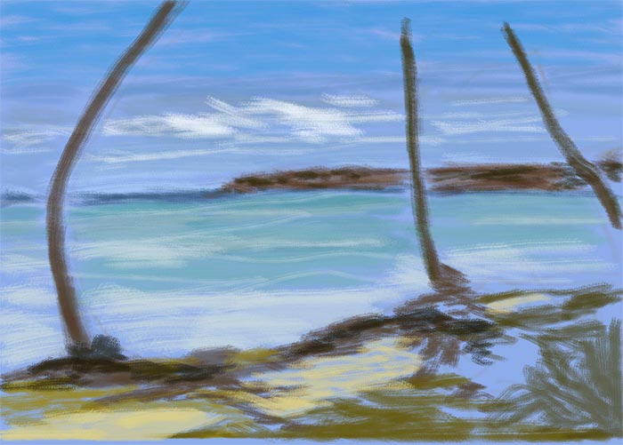 Fig. 9 shows further enhancements to the painting which include the light shades to the right of the tree trunks and the tree leaves. For the tree leaves, I use the predominant color of the tree leaves which is a slight yellowish brown but not exactly green. You should experiment with the colors to make sure that it matches the overall scene of the painting. I deliberately kept a neutral tone to the entire picture without giving any color emphasis to any specific part of the painting. Remember, you can do this very easily by making use of a color that is bolder in presence than the other colors on the canvas. This is often used to accentuate a sunset or areas of light and shade within a painting or even making flowers or other specific items to stand out. The final part of the painting is to do the area of dark/hazy blue near the sandy beach shore and we end up with our final painting shown in fig. 1