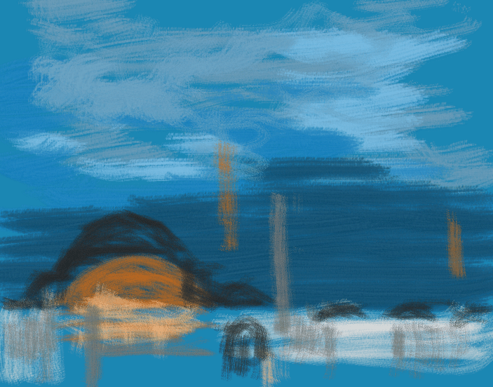 The first step towards painting is to do the ‘fill colors’ for the sky and the general main colors of the picture (fig. 2). The canvas was picked out with the bluish color and then using the ‘mist’ brush we sketch out the sky using a variation of whitish/grey colors. Try to do the strokes horizontally at first and then use a swirling action to create the cloud effects. The original picture showed a dark shade of the sky going down to the low horizon and this was rendered using a deeper color of blue. Notice also the horizon also has lighter shades in the sky which adds good effect to the overall painting without too much effort.