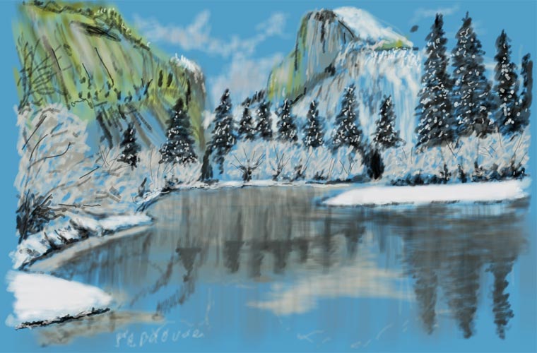 In fig. 6 the reflections in the water are added and I use a grey color still with the spray tool and simply go around creating the reflections in left to right strokes. Notice that I also use very vertical strokes for some parts of the water reflections. Whenever you view a landscape picture that you like, try to look closely at the features such as reflections and you will be surprised how varied this can be. By adding further highlights you should arrive at something close to the original painting shown in fig. 1. Again, if you compare the previous image along with the original, you will see that I have removed some of the harshness of the lake reflections by going over it again with a lighter color. In addition, I have added some snowy specks on the evergreen trees to add charm to the whole painting.