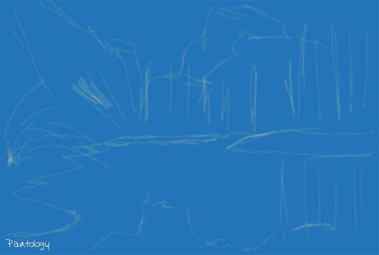 In the next step (fig 4), I lay down more of the trees and define the lake edge. Note again, that I am not too worried about the actual shape or form, I simply ‘fill’ in the areas where the trees and bushes should be. This is probably a good time to mention the pace or speed at which one draws or paints. Typically, a painting like this takes me about 30 minutes or so and I usually get my ideas from the wide selection of pictures found on the internet. I feel that if you work with some speed, you don’t focus too much on your mistakes and you continue to use your eyes and intuition to build up the painting. I would recommend that you also work with a relatively fast speed and keep on learning from your attempts and allow yourself to improve with each effort.