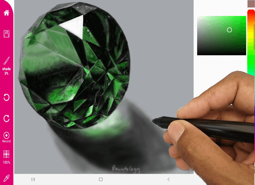 You can see an example of my early photo realistic drawing where I put my skills to the test in creating an emerald drawing on a tablet using the Paintology app.