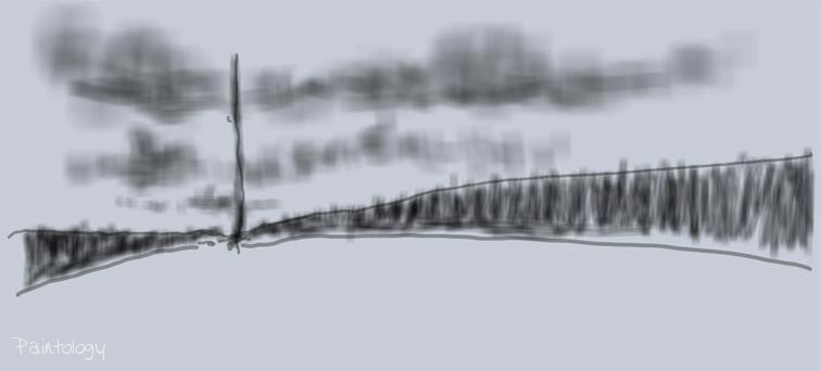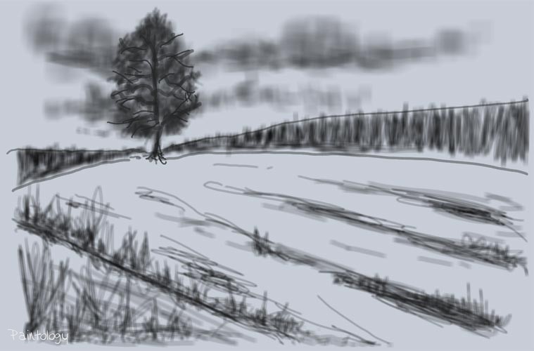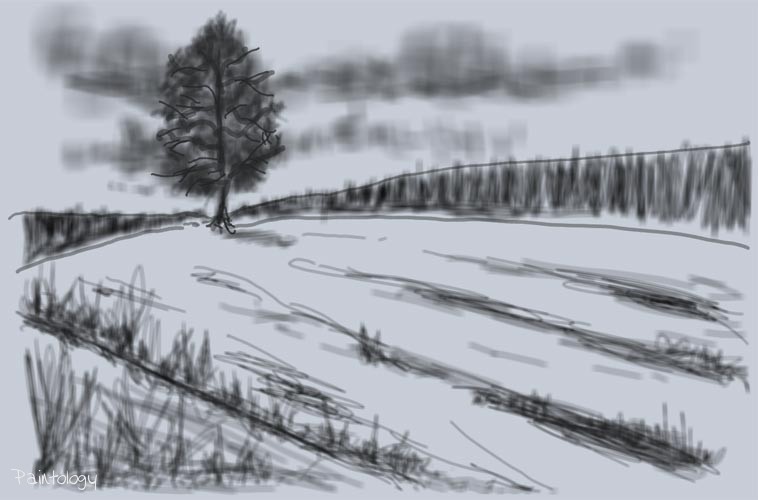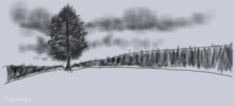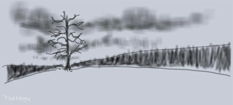 Open up the ‘Paintologoy with Fred’ app and create a new canvas color which is slightly off-white. Using a pen tool with the right size sketch the outline of the main parts of the landscape as shown in fig. 3. Don’t worry about the exact measurements, just mark where the tree is going to be and draw the lines coming out as shown. This will represent the trees coming to the foreground from a far distance on both the left and right hand side of the drawing.