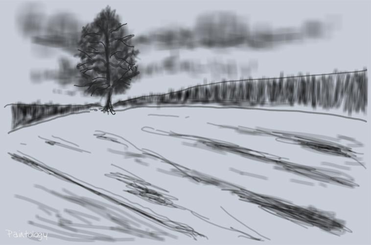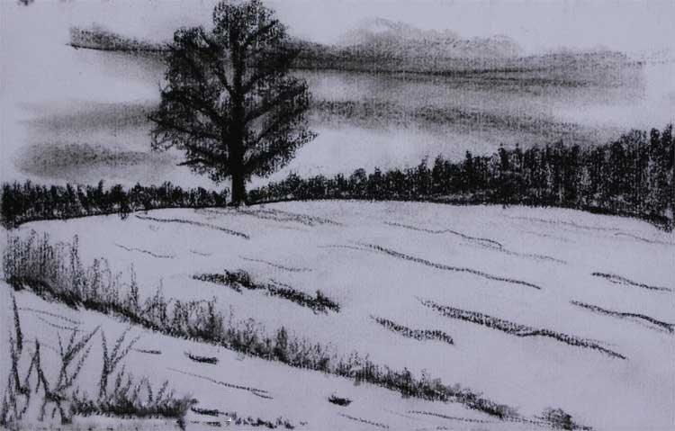 The picture we are going to paint is one I did in charcoal a while ago (fig. 1) and you can find this in the gallery. I picked this one for the first lesson, because the subject matter is simple and more importantly I want to get you practicing with perspective. This is very important for landscape drawing since a sense of perspective will make your painting more realistic. On this picture, the tree is the highlight of the picture and it just so happens that the center of the perspective is located there.