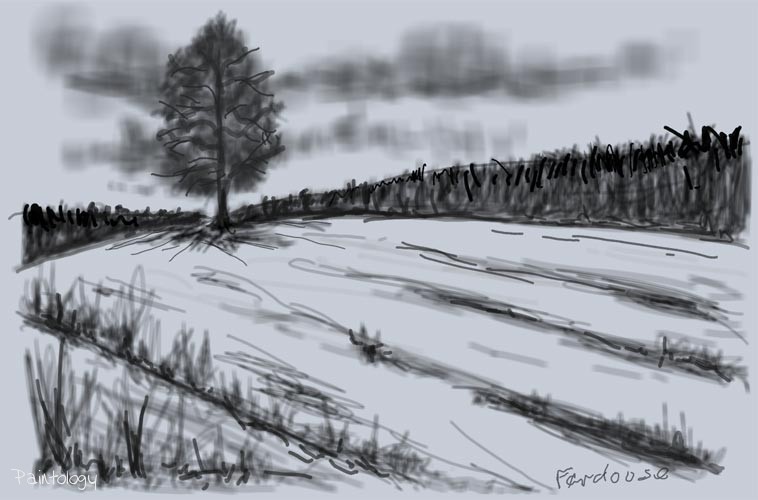 Using a combination of spray and line tools I have made further highlights and bold outlines onto the painting to give added depth to the final drawing (fig. 11). You can see how at the final stage you can build up the painting to your own liking. I focused on the tree giving it a stronger base which brought the tree a lot closer to the eye. By outlining and adding highlights and further shades you can vary the mood and the depth of the painting but be careful of not overdoing it.