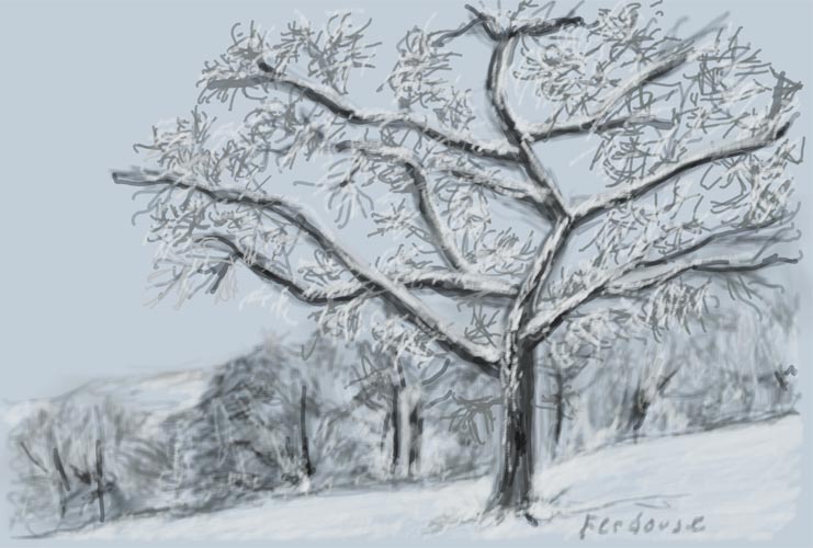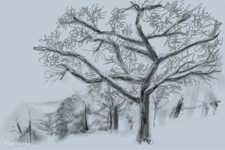 We continue to add details including the skeletal branches of the tree, see fig. 4. Notice, how the picture doesn’t look anywhere near the original and this is where we begin our fun stuff of adding highlights and tones to give more depth and realism to the whole picture. If you examine the final painting, you will see that I kept the original color but also introduced some white and black hues to give more substance to the tree-trunks and the rear plantation. The painting is ambiguous as it suggests that the some of the branches are white in its natural form or could be due to snow falling on the branches. This can be further substantiated with the hint of white that has been added to the gentle gradient of the hill as well as the hills in the far distance. This is the kind of painting that you want to produce that keeps the viewer engaged with the scene and keeps them thinking.