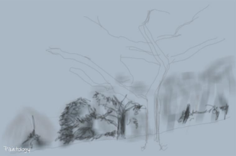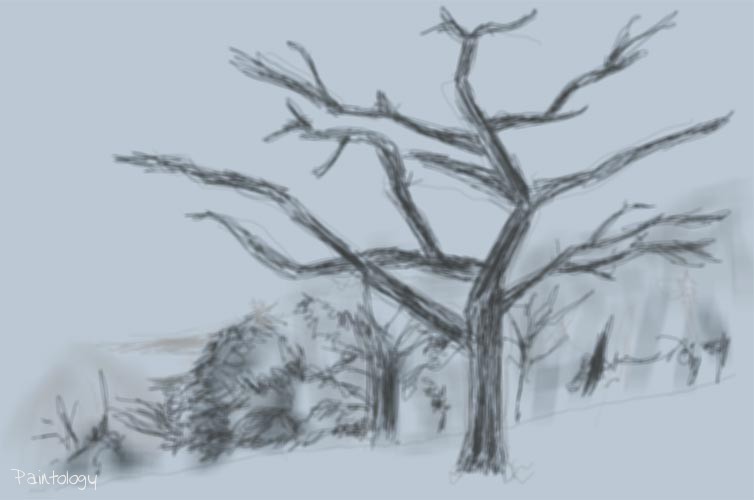 Let’s start by drawing the outline as we did before in Lesson 1 (fig. 1). The canvas we choose is more of a grayish background so we can add more highlights in the foreground to give more prominence to the main subjects. In this case, the tree with the whiter shades of branches/leaves will be more pronounced, see the original drawing. While still keeping the spray tool, we fill in sections of the background with a lighter shade of grey and begin to paint in the foliage and some tree trunks (fig. 2). Notice that the brush strokes are in no particular manner and basically just filling in background information. Don’t worry about creating too much detail here. The background should be tackled before doing the tree at the foreground as we don’t have to worry about drawing around the edges of the tree.