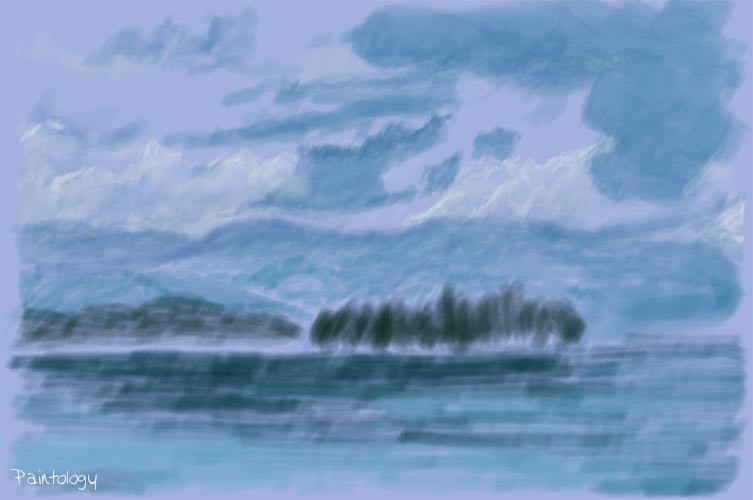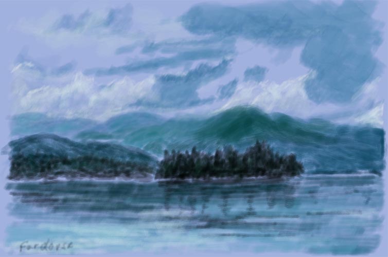 With a little bit more work and adjusting the spray brush size, I add more details to the hills and trees as shown in fig. 5. Notice, how I deliberately add a bolder color for the hill that is closest to us in the same manner explained previously. With further touches, I paint in the reflections and accentuate other parts of the painting all using the spray tool to arrive at the final painting shown in fig. 1. You could continue with this painting and add foregrounds that I was talking about earlier, perhaps another crevice of land in the foreground. If you did add information in the foreground it should follow the same rules of landscape painting that I described earlier. By all means, don’t follow my instructions in a parrot fashion, experiment and play with different colors, shades and brush styles to see what you can bring out from your own painting.