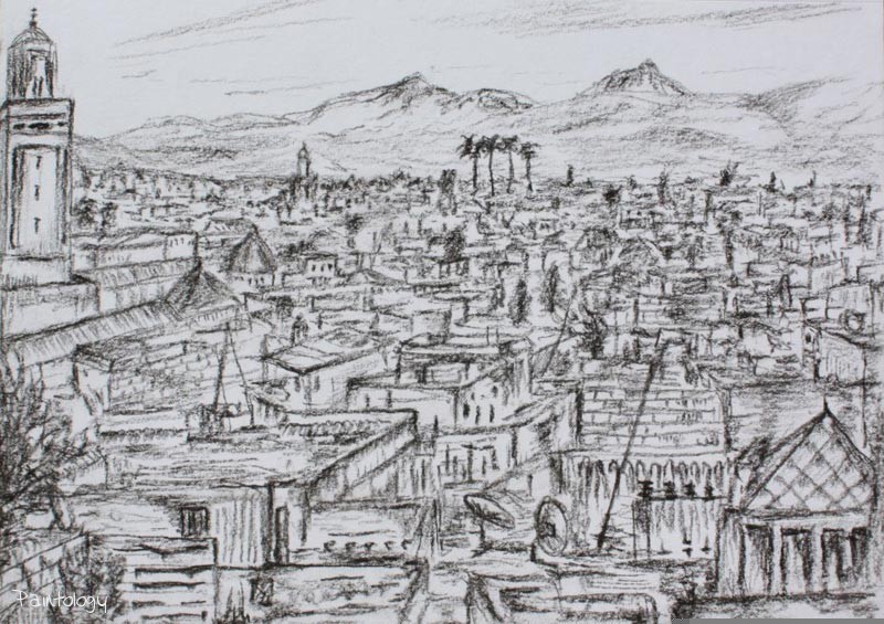 When I was in Morocco, I was having lunch atop a rooftop restaurant that gave a wonderful 360 degrees view of the Marrakech city. Fortunately, I had my drawing pad and pencil with me and went about depicting what I saw all the way to the Atlas mountains in the far distance. As I was sketching this interesting scene with the warm sun beating over me, I noticed that the far distance objects were too small to warrant any details. So I automatically adjusted my drawing to providing almost scribbles for the far distance scenes and focussed more on the details in nearby. I eventually ended up with the sketch shown in Fig.1b where you can see that the details in the far distance just captures the essence of the city rather without providing any details. As you get closer there are far more details with the blocky buildings, rooftops, shapes etc. The same methodology applies to landscape painting where you diffuse out the far distance scenes and give more shape, character and contrast to the foreground scenes. You will see that the painting I have selected for this lesson more or less follows this methodology.