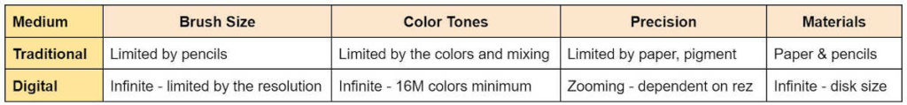 When I am drawing on the digital tablet I understand the limitations of pencil and paper are surpassed by drawing on the digital medium. For example, if you compare a digital brush with a traditional brush, you get a greater benefit by the digital app and thus an increased bandwidth to make your drawings, see Table 1.