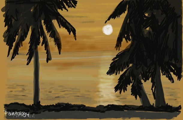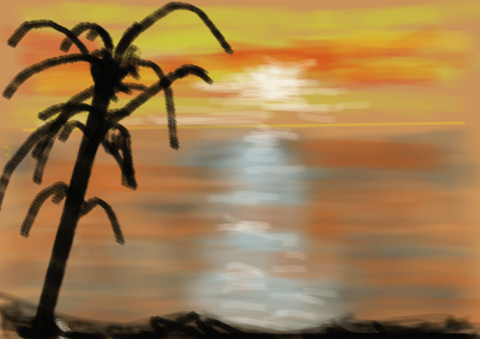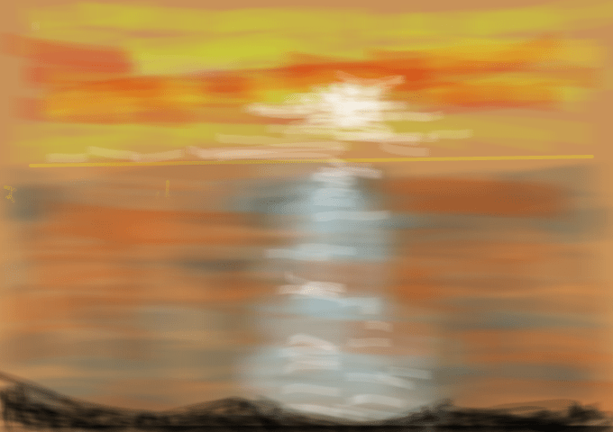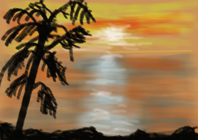 Once we have created a more horizontal line using the line brush tool, we go about creating the sea using almost the same color as the sky mainly orange and hints of grey (fig. 4). Also comes an interesting part where we draw the reflections of the sunset in the water. This is simply a whitish color using the same brush tool as before and simply moving back and forths and coming to the baseline. We etch in the land which is predominantly black. Notice you can take much care in your painting and work out the details slowly, this painting was done in about 10-15 mins so you will definitely see a few imperfections. However, to get the most refinement and accuracy in the painting nothing can beat the stylus. Check out some of the paintings of sunsets that I did using the stylus. See Image-1 and Image-2.