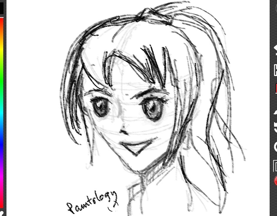 This is a third attempt at drawing a manga face on the Paintology app. The techniques for drawing a face is somewhat similar to ways that have been taught in drawing classes ie. sphere for a head followed by intersectional lines for the eyes, lips, mouth, ears etc.
