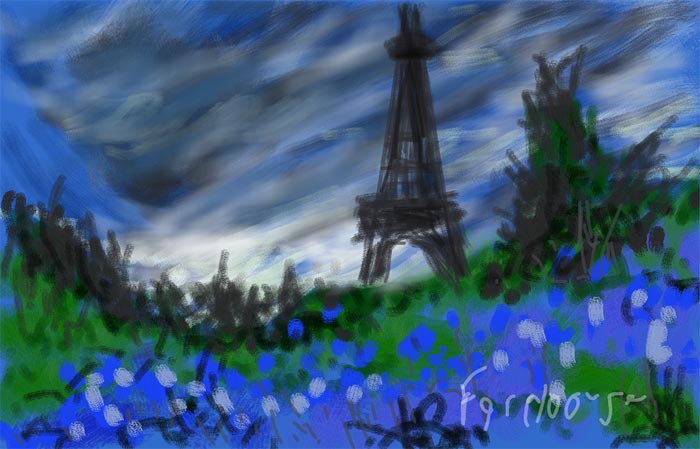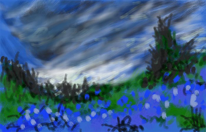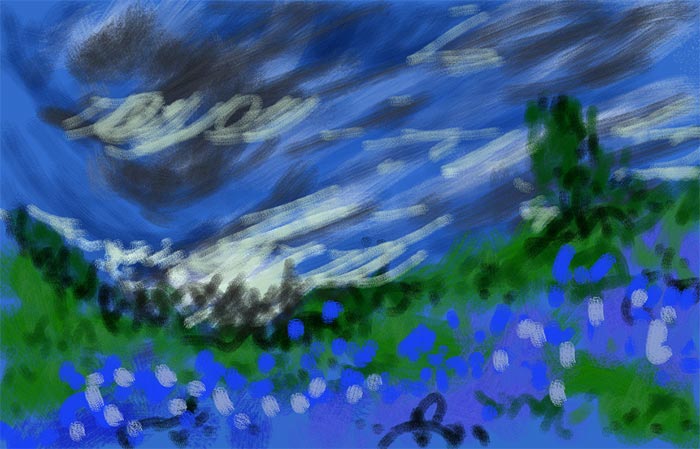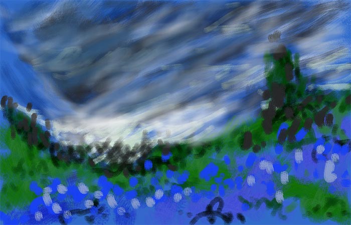 In figs. 3 and 4 I have further defined the painting by switching to the ‘shade’ brush tool and going over other parts of the painting using my finger. In particular, I was able to get a ‘wooly’ effect for the sky. I add more foreground information to give it some interest and finally etch in the tower as shown. For the tower, I switched to the ‘line’ tool to draw the outline by using two points of my fingers to draw straight lines. I then used the darker colors with the shade tool to further define the tower to give the final painting shown in fig 1.
