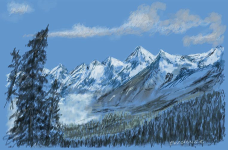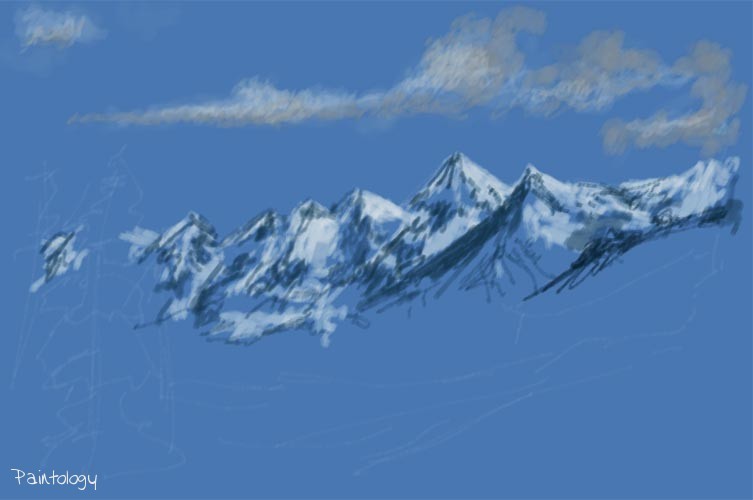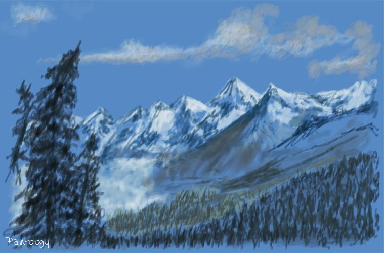 Fig. 4 shows more information of the same tool but keeping a tight control over the colors to blend some of the other features of the landscape. If you compare this picture to the final, you will see that I am following the same method as before where I have my fun and fill in the details to give depth and realism to the whole painting. The ‘filled-in’ information in the final painting are only at specific spots but as you can see it does make a difference to the overall painting. If you get a chance, open up both images, fig-1(final) and fig-4 (penultimate) side by side and compare where the additional ‘highlights’ have been added. There are no hard and fixed rules for this but with experience, you will develop your own method and style of ‘bringing out the painting’ so please don’t worry about getting this exactly right at this stage. In this painting, I have highlighted the large sloping mountain edge close to us and also the trees in the foreground. From a technical point of view, landscapes have a higher contrast in the foreground so adding deeper saturated colors in the foreground will make the painting pop-out.