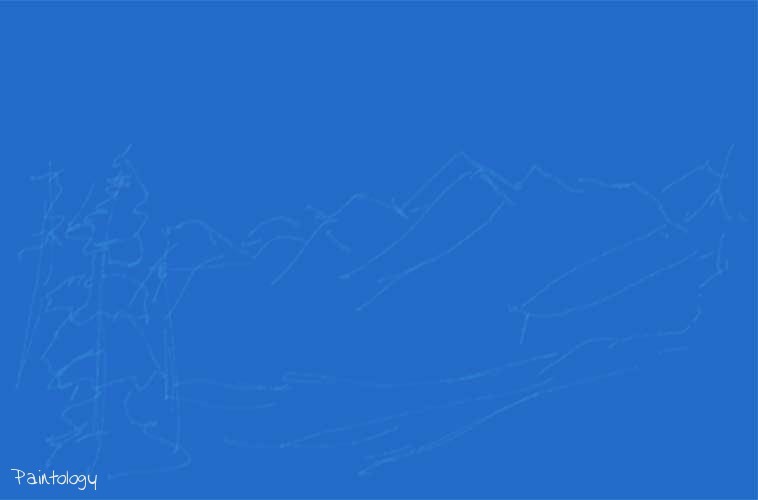 Next we use a combination of dark blue and white to build the mountain tops and the clouds as shown in fig. 3. Similar to Bob Ross, I don’t follow any specific format for the way I do the mountains or the clouds and you can use your imagination to do the same. Just follow your instincts and try to get something similar but not exactly and with practice your brush strokes will automatically create the effect you are looking for.