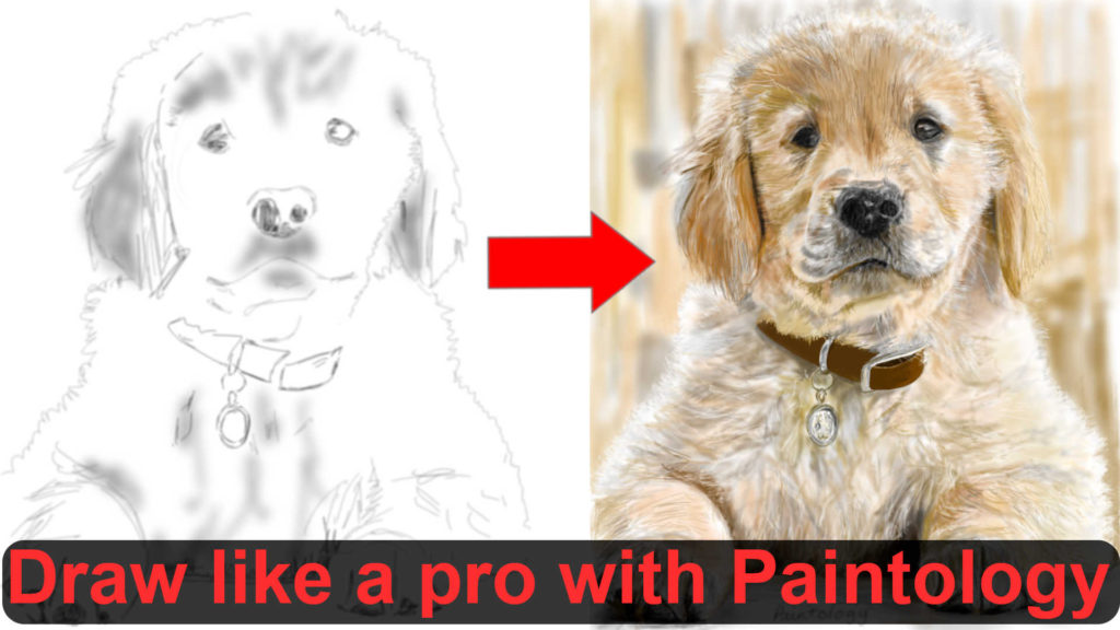 Sometimes, the outline drawing also has specific areas of dark and light. Again, the Paintology app has rapid ways to do this. You can use the same brush (shade) of the app, increase the size and select the gray tones to make these marks. If you examine the photo realistic drawing of the dog above, you will see some dark and lighter areas ie. around the eyes, nose and of course the body. You can go as detailed as you want but often the reference for the eyes location and nose and mouths are sufficient.