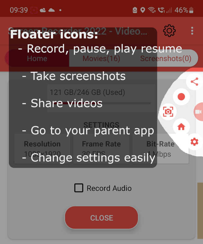 In the Paintology Recorder app there is no confusion, once installed you go to the parent app and launch the action icons that operates the recorder and screen shots. This is far more intuitive than other methods, since you now have a relationship between the parent app and the overlay action icons.