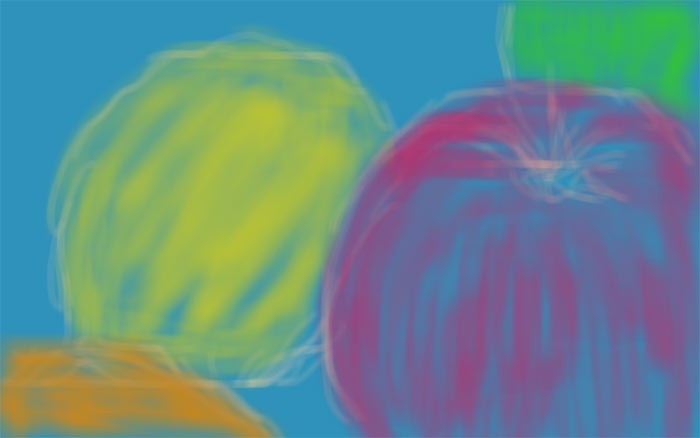 With this painting (fig 1), I wanted to pick a subject that most painters and artists usually do once in awhile to keep their skills honed. The advantage of drawing fruits is that you get a good handle on the color, shade, texture and the light that falls on the fruits. I found a photo in Google images and thought it would be a good one for this training. The first part to the drawing is to pick the right canvas color which was a sky blue and then used the shade tool with a off-white color to draw the outline of the fruits (fig. 2).