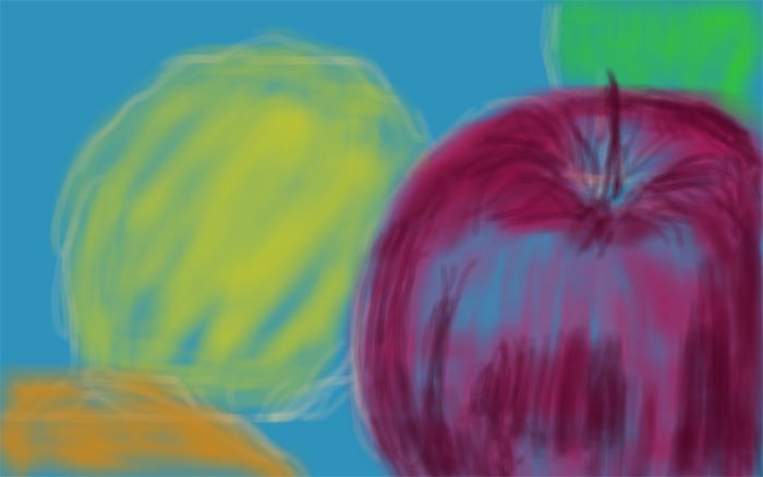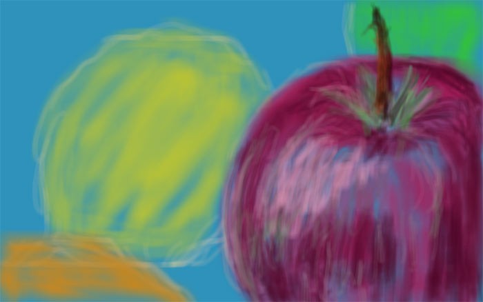 I use general strokes that follow the outline of the fruit and picked the appropriate colors to fill the objects with the respective colors (fig. 3). I then focused on the apple and decided to build this up by applying more of the red and changing the tonal colors from the pallette. The beauty of the shade tool is that you can continue to build the layers by going over it repeatedly and the layers will darken. You can exploit this to create the solidity of the apple as I did in fig. 4. By continuing to build on the colors and paying attention to the shadows and the light falling on the apple, I finally ended up with picture in fig. 5. By using a different gradient of green, grey and darker colors of the red, I was able to create a realistic look to the area around the stem.